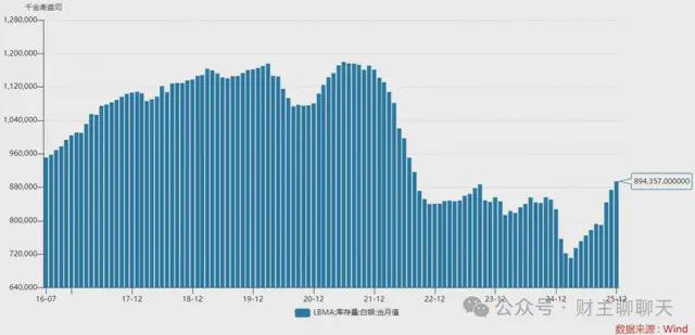 长期以来,伦敦的LBMA库存量长期位居第一。但最近2年多来,已经被Comex超过,Comex的库存每天都会公布前一个交易日的库存情况,但LBMA一般只在月中公布上个月月底的数据——最新的白银库存是2025年12月份数据,8943.57万盎司。而且,与很多人想象的不一样,伦敦的白银库存自2025年3月到达低点之后,过去一年来一直都是在抬升的(后面我会解释为什么抬升)。