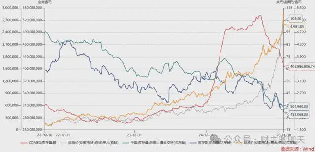 在全球的三大显性库存里,如果把时间限定在2025年3月(LBMA库存最低点)到2025年12月(LBMA的最新数据),我们将会发现一个有趣的结果,Comex减少的2亿盎司的白银库存,大致等于LBMA增加的2亿盎司的白银库存……