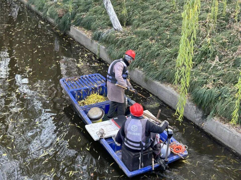 过桥的时候,一艘小船慢悠悠地飘出桥洞,船头站着一位身穿安全背心的老大爷,正在小心翼翼地用网捞出水里的落叶,红色安全帽下的头发已是灰白;