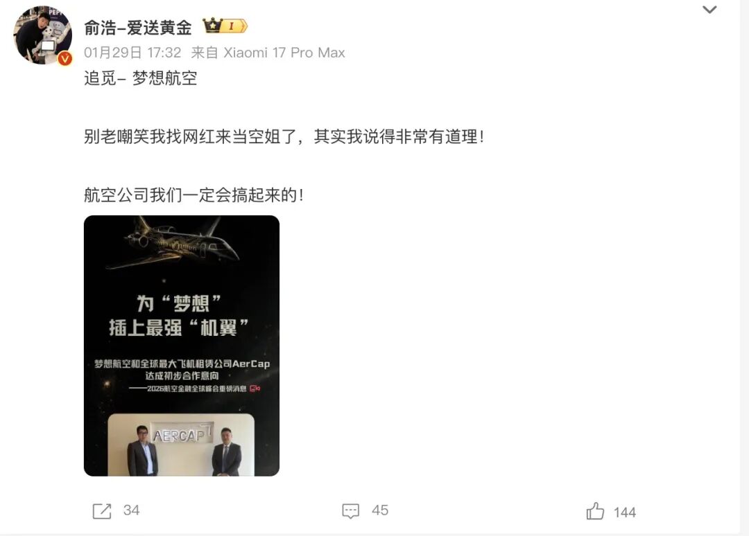 2026年2月的第一天,俞浩再次在科技圈刷屏。