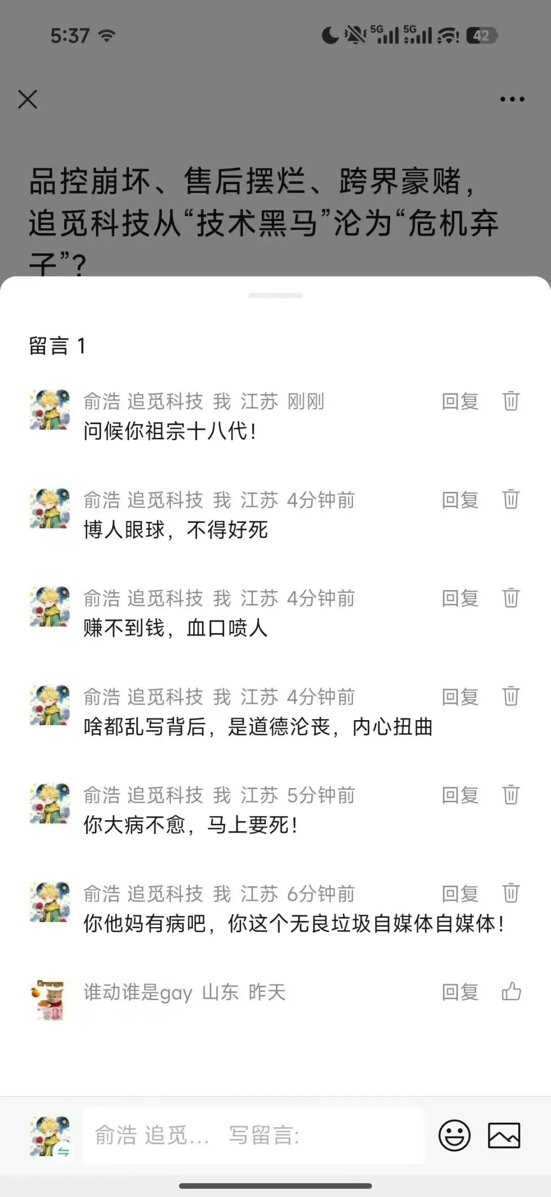 在一篇讨论追觅现状的自媒体文章评论区,俞浩在5分钟内连续发布6条评论,措辞直接、激烈,甚至粗俗,对文章观点和作者本人展开密集反击。