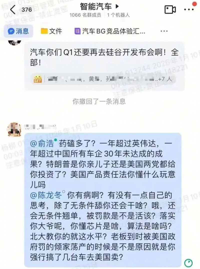 更尖锐的是,他直接质问管理层是否真正理解美国法律体系:“老板到时被美国政府罚得倾家荡产,是不是因为你强行搞了几台车去美国卖?”