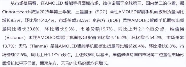 根据CINNO Research数据,2025年第三季度,维信诺以13.7%的份额位居全球柔性AMOLED智能手机面板市场第三位,国内第二位,市场份额从2022年的6.8%稳步提升。
