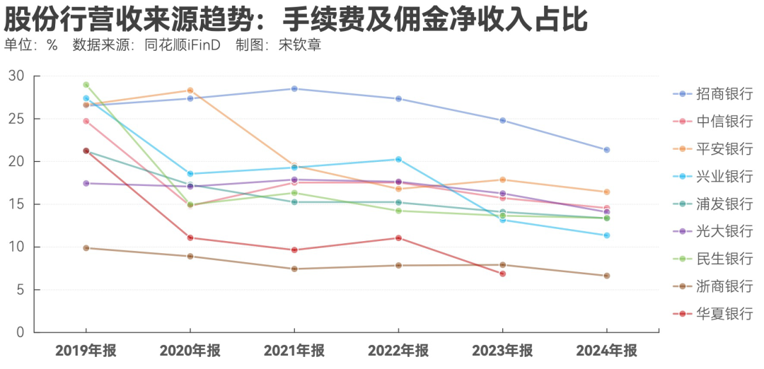 这一占比高于很多股份行,但依然低于招商银行,其过去五年手续费和佣金的营收占比几乎维持在25%以上。