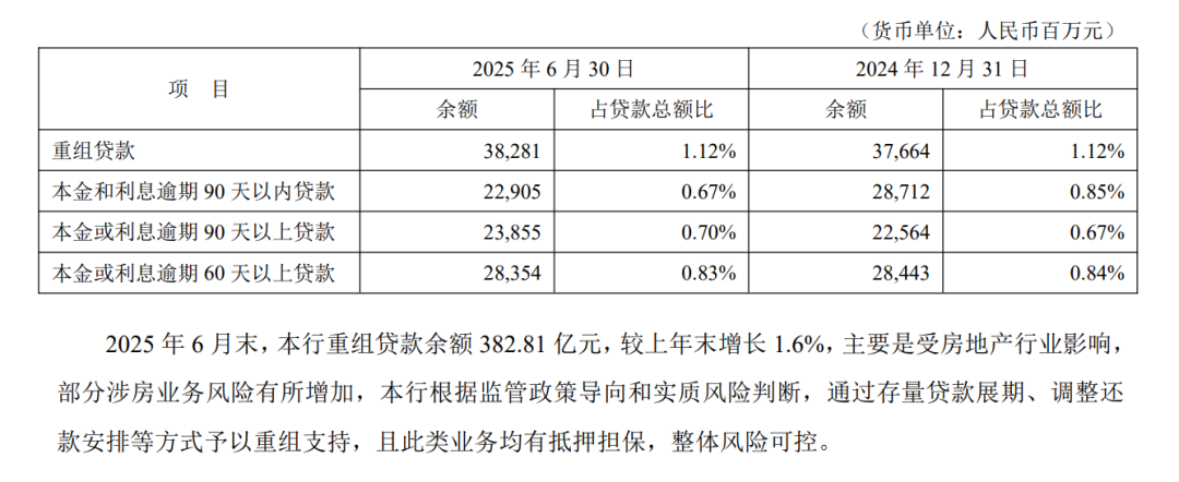 截至2025年9月末,平安银行对公房地产贷款不良率2.20%,较上年末上升0.41个百分点,说明对公贷款的资产质量也出现下滑。2025年中报也显示,重组贷款(即针对不良贷款调整利率或期限以避免逾期的贷款,主要为对公贷款)余额上升1.6%,主要是受到房地产行业影响。拉长时间线发现,平安银行重组贷款余额原来自2021年就出现上升。