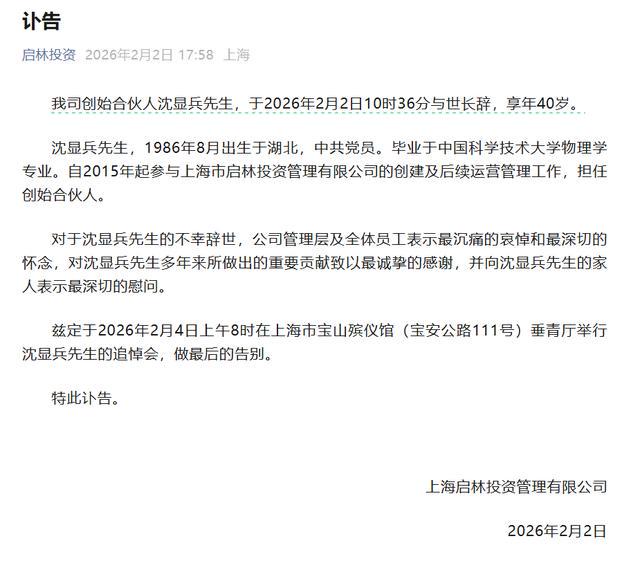 2月2日,百亿级私募启林投资发布讣告称,公司创始合伙人沈显兵于2026年2月2日10时36分与世长辞,享年40岁。