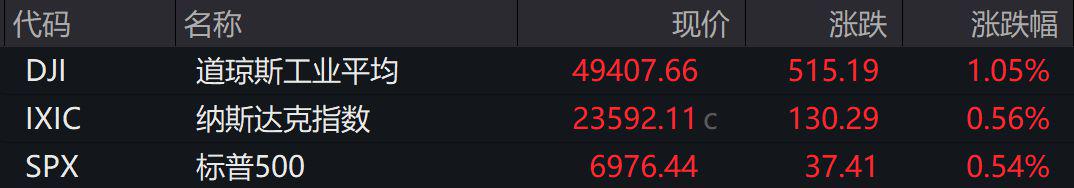 美东时间2月2日16:00(北京时间2月3日5:00),道指收涨515.19点,报49407.66点,涨幅为1.05%;纳指收涨130.29点,报23592.11点,涨幅为0.56%;标普500指数收涨37.41点,报6976.44点,涨幅为0.54%。