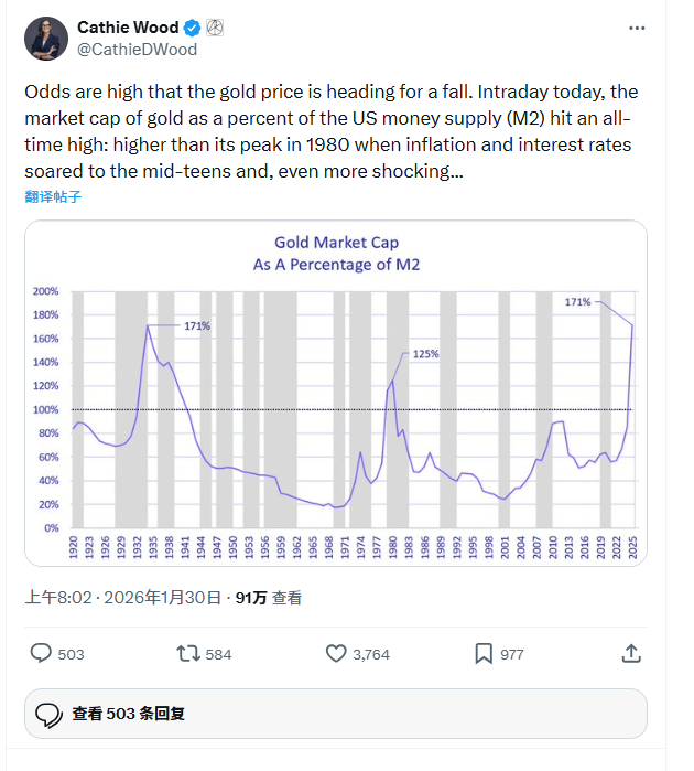 据财联社报道,1月30日,金价暴跌12%至5000美元以下,创下自20世纪80年代初以来最大单日跌幅,就在这次暴跌前几个小时,华尔街明星基金经理、方舟投资的掌门人“木头姐”凯茜•伍德(Cathie Wood)在社交媒体X上发帖暗示,金价接近峰值的可能性正在上升。她认为如今的泡沫不在人工智能领域,而是在黄金领域。另一方面,如果美元走强,黄金似乎会变得脆弱。她以1980年至2000年期间为例,指出当时美元走强的同时,黄金价格下跌了超过60%。她警告称,黄金的历史性上涨是一个投机泡沫,即将破裂。她的论证基于历史估值指标、宏观经济背景以及美元走势。