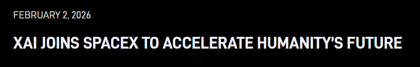 当地时间2月2日,太空探索技术公司(SpaceX)在官网发布由马斯克署名的声明,确认与人工智能企业xAI公司合并。声明称,合并后公司将整合人工智能、火箭、天基互联网、移动设备直连的通信。