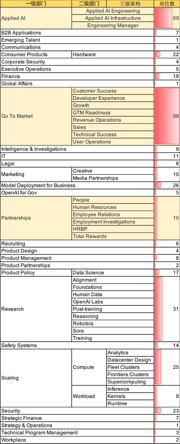 岗位增长: 面向市场的销售(Sales)和企业级 AI 应用部门(Model Deployment for Business)成为增长最快的板块 。