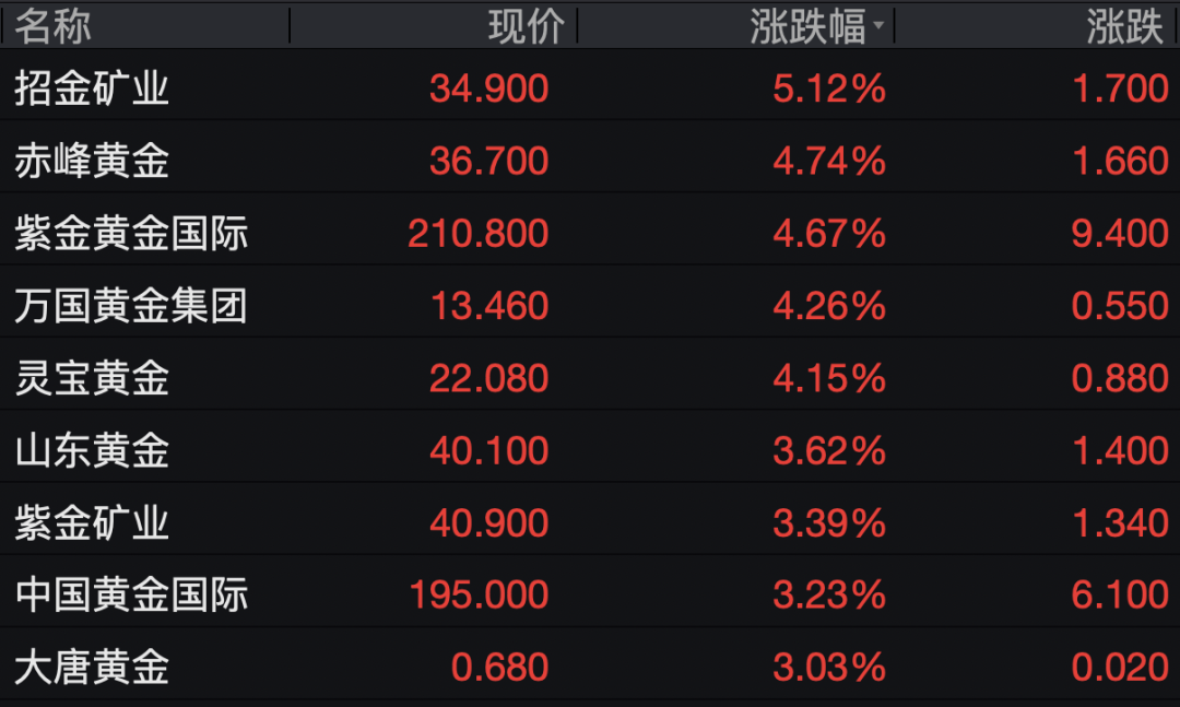 黄金股普涨,招金矿业涨超5%,赤峰黄金、 紫金黄金国际、万国黄金集团涨超4%。