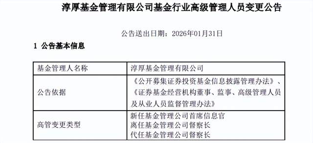 距长宁国资拿下淳厚基金实控权、核心高管“换血”刚满三周,1月31日,公司再次迎来两名高管变更。根据公司公告,因工作安排,督察长沈志婷离任,由总经理左季庆代任督察长;新任首席信息官(副总经理)刘玉生正式上任。至此,国资股东成为淳厚基金的实控人后,公司高管团队全面大洗牌。