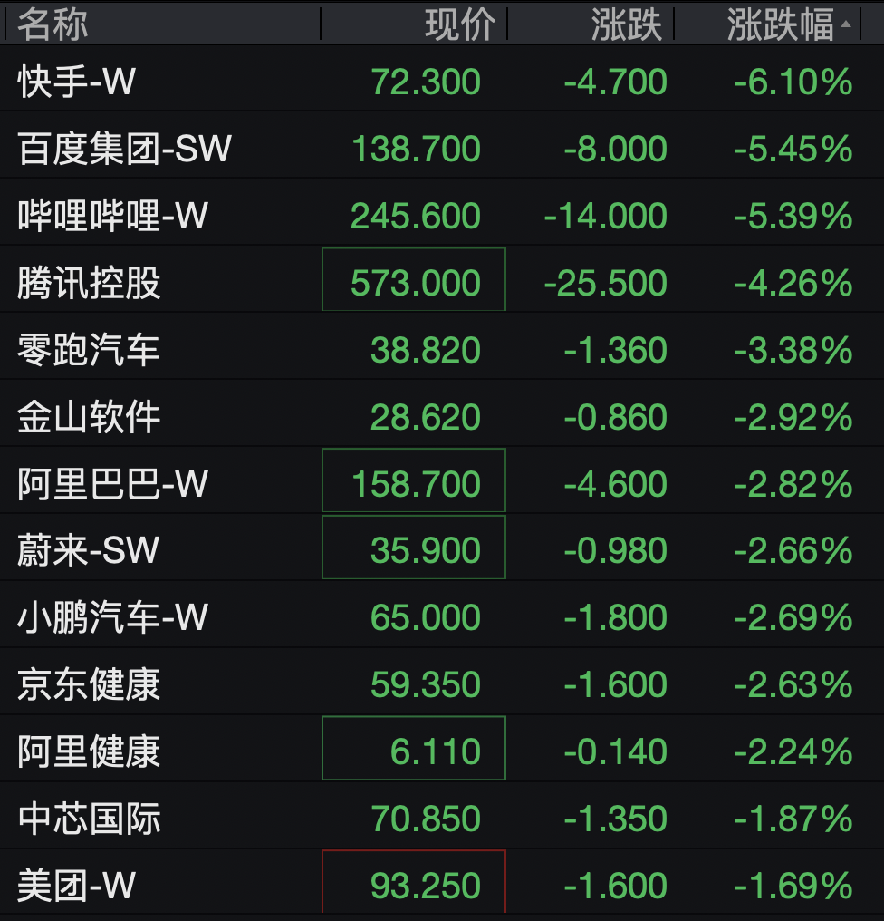 大型科网股集体下挫,快手跌超6%,百度集团、哔哩哔哩跌超5%,腾讯控股跌超4%,阿里巴巴、中芯国际、美团均走低。