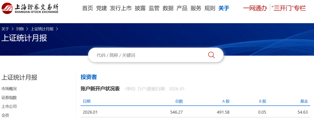 2月3日,上交所数据显示,2026年1月A股新开户491.58万户,环比增长89%,同比增长213%。