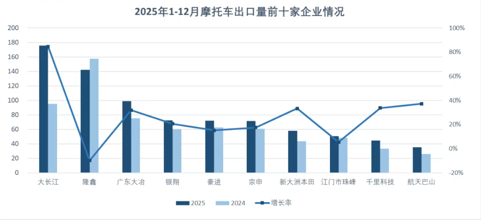 山城重庆的隆鑫摩托,是2024年度我国摩托车出口的冠军企业。2025年1-12月隆鑫的出口量约为140万辆,排名行业第二位。