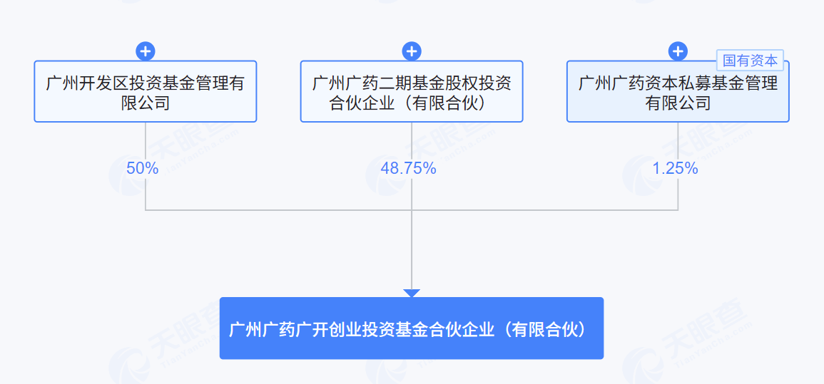 广药广开基金出资方及出资比例为广开基金占50%、广药二期基金占48.75%、广药资本占1.25%。其中,出资占比最多的广开基金为黄埔投资控股(广州)有限公司和广州金控基金管理有限公司的合资公司。