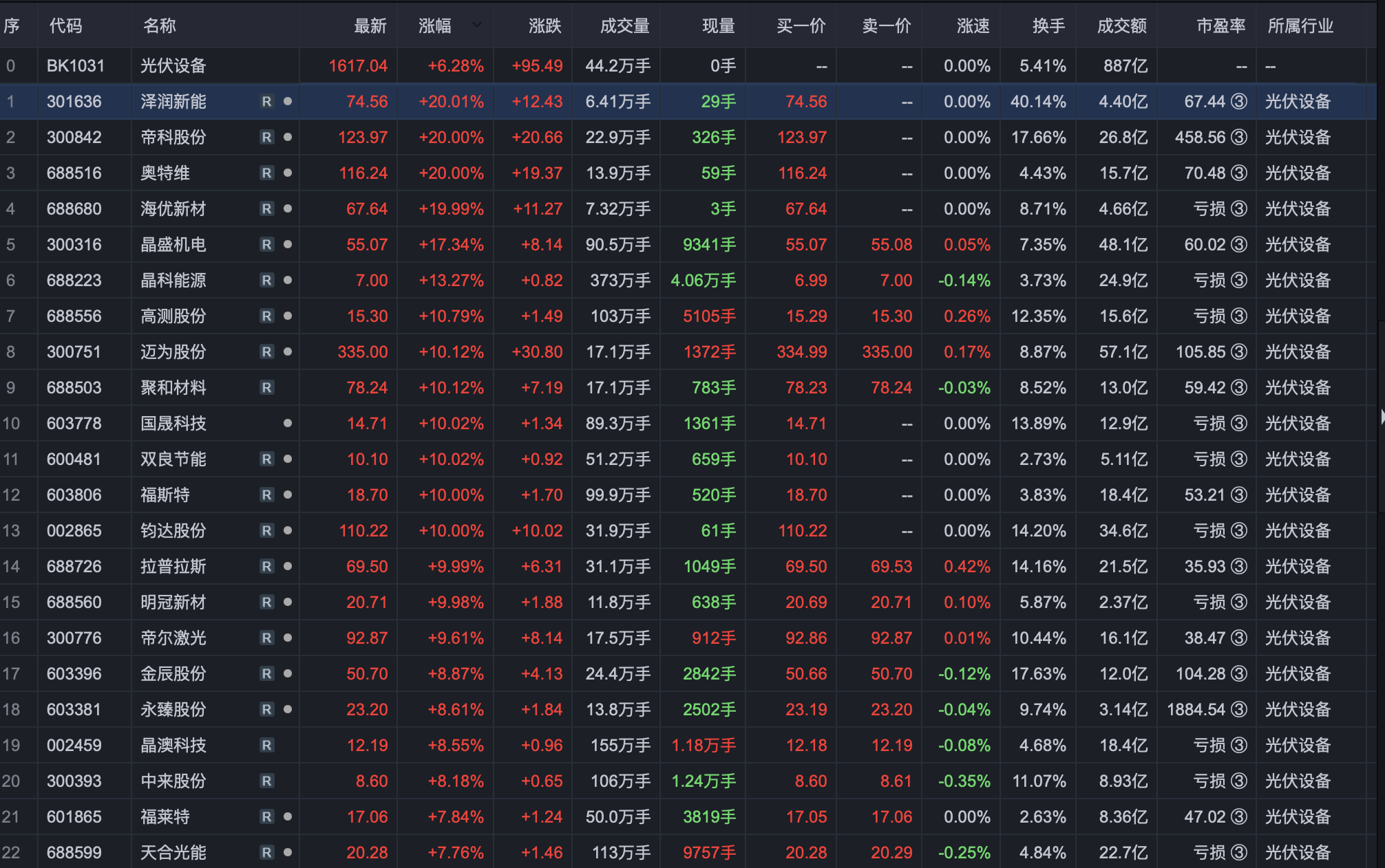 截至2月3日收盘,光伏ETF(515790.SH)报收1.122,涨幅高达6.05%;个股走势方面,迈为股份(300751.SZ)、钧达股份(002865.SZ)、泽润新能(301636.SZ)等多只个股涨停,隆基绿能(601012.SH)、通威股份(600438.SH)等多只个股涨幅超4.5%。