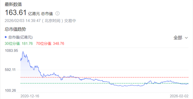 截至2026年2月3日14:39分,蓝月亮总市值余163.61亿港元,较巅峰时期的1083.95亿元港元,蒸发逾920亿港元;