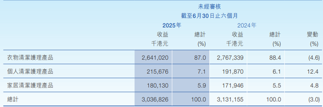 2020年-2025年上半年,衣物清洁护理产品的营收占公司整体营收的比例依次为80.0%、85.0%、85.8%、88.8%、89.1%和87.0%,该板块贡献了绝大部分的收益,而个人清洁护理及家居清洁护理板块对业绩的贡献并不明显。