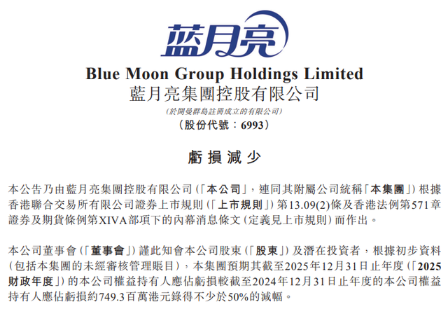 1月12日,蓝月亮集团发布公告称,预计截至2025年12月31日止年度的本公司权益持有人应占亏损将较截至2024年12月31日止年度的本公司权益持有人应占亏损约7.49亿元录得不少于50%的减幅。