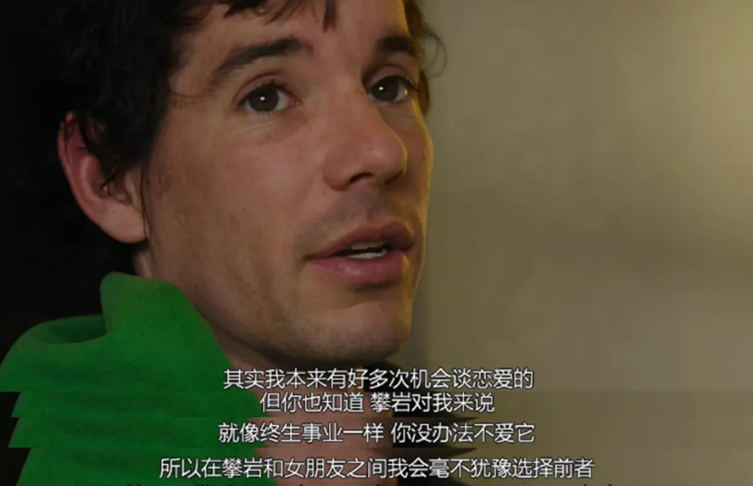 在《徒手攀岩》这部纪录片中,亚历克斯面对镜头时说,“和这个不攀岩的女孩在一起后,我就一直在受伤。事情发生后,我想着跟她分手的。这对我的攀岩太不好了。”