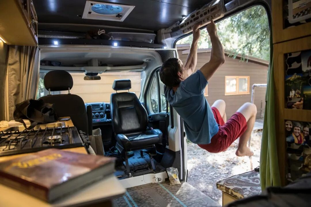 亚历克斯住在优胜美地的时候,每天在房车里面健身。