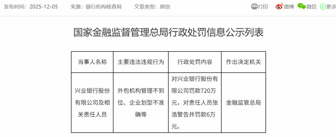 公开表显示,兴业银行及相关责任人员因存在外包机构管理不到位、企业划型不准确等违法违规行为,被罚款720万元,责任人员张浩被警告并罚款6万元。
