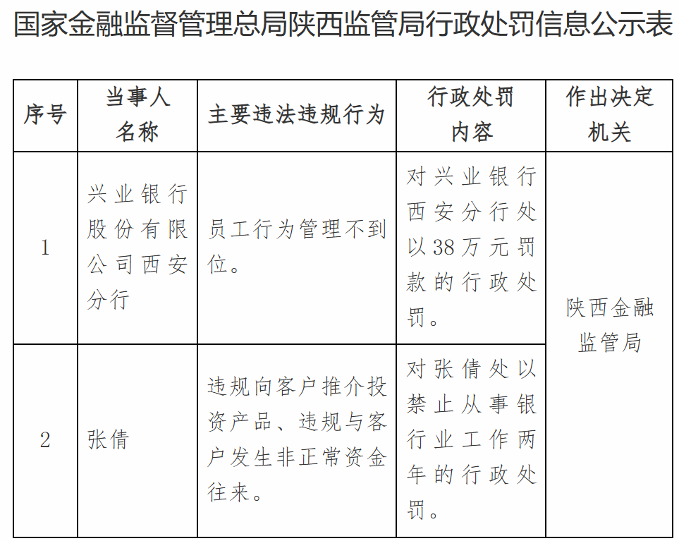 因员工行为管理不到位,兴业银行西安分行被罚款38万元。