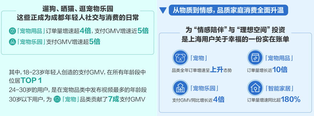 成都的宠物用品订单量上涨超4倍、销售额涨了近5倍,宠物乐园销售增速超5倍;上海的宠物用品订单增长近10倍,宠物乐园销售额涨了近4倍