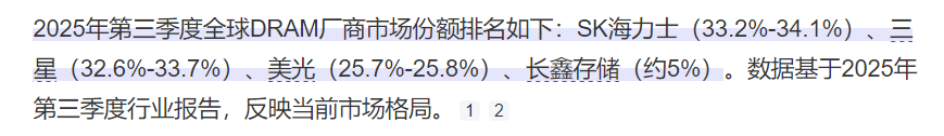 不过,从市场份额来看,三星、SK海力士、美光三大巨头仍牢牢占据着超90%的市场份额,长鑫存储的市占率只有不到5%。