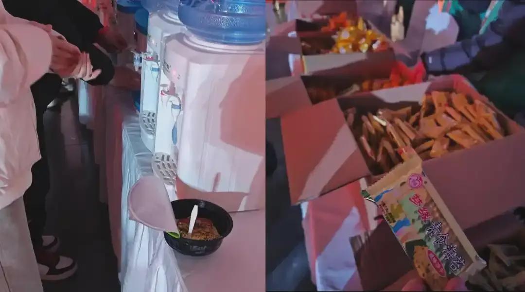 更刺眼的是分层待遇,领导在内场围着暖风机吃热餐,员工却在外场啃面包、就矿泉水、煮泡面。