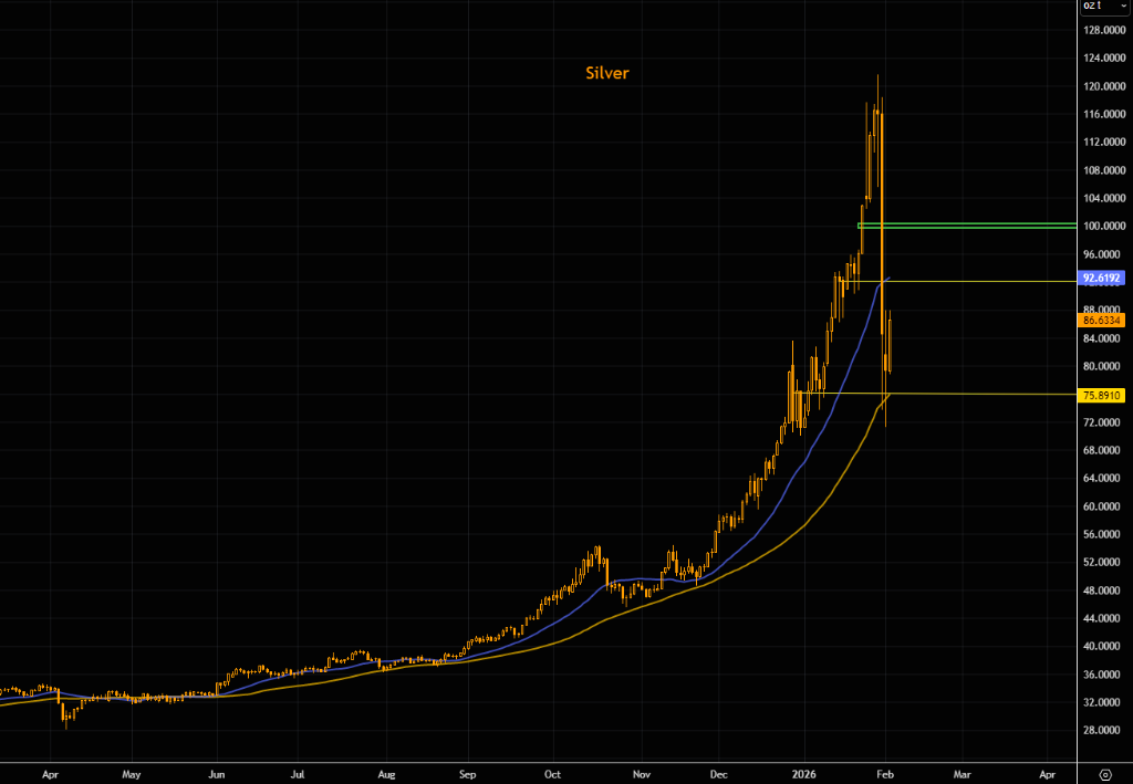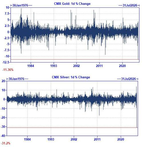 最新的市场动态显示,金银价格在经历猛烈回调后试图企稳。据高盛的数据,此次抛售在某些指标上甚至超过了以往的极端行情,COMEX黄金和白银创下了自1980年代初以来最大的单日跌幅。虽然价格已从低点回升,但波动率仍处于极高水平,期权流动性一度枯竭,这表明市场结构依然脆弱,短期内可能仍将面临不稳定的双向价格波动。