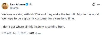 就在这篇报道发出一天后的2月1日,人在台湾的黄仁勋回应称,有关英伟达与OpenAI合作出现摩擦的说法“纯属无稽之谈”,并强调英伟达“一定会参与”OpenAI当前融资轮,“因为这是一项极佳的投资……OpenAI我们这个时代最具影响力的企业之一”。