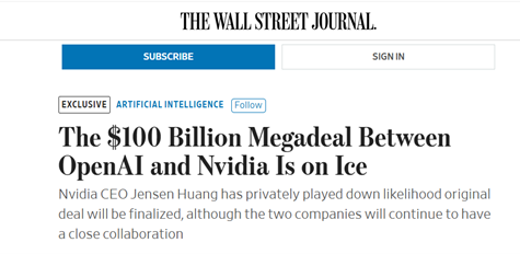在这次合作官宣之后的几个月里,外界没有看到后续的进展。而1月31日,《华尔街日报》发不了一篇名为“英伟达与 OpenAI 的千亿美元重磅交易已暂时搁置”,透露了很多英伟达方面的内部消息。