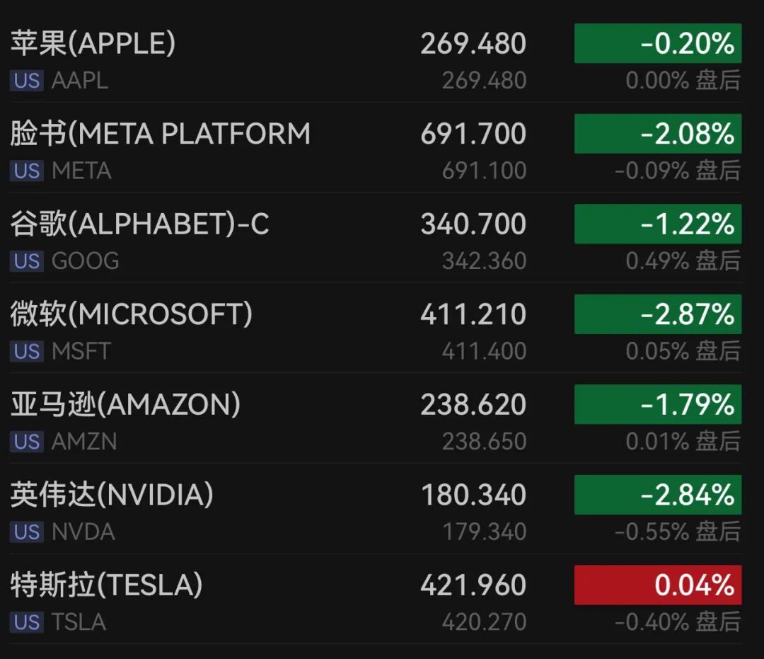 大型科技股普遍承压。英伟达收跌2.84%,连续第三个交易日回落。微软下跌2.87%,特斯拉基本持平、微涨0.04%,苹果回落0.20%。AlphabetA类股下跌1.16%,C类股跌1.22%;亚马逊下挫1.79%,博通跌幅达3.26%,超威半导体下跌1.69%,Meta Platforms下滑2.08%。