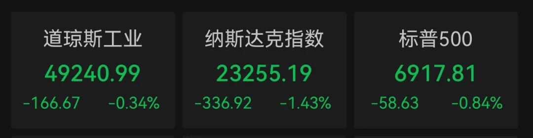 截至收盘,道琼斯工业平均指数下跌166.67点,跌幅0.34%,报49240.99点;标普500指数下跌58.63点,跌幅0.84%,报6917.81点;纳斯达克综合指数下跌336.92点,跌幅1.43%,报23255.19点,几乎完全回吐年初以来的涨幅。