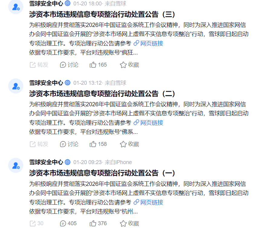 另一方面是各大互联网平台内部自查。雪球平台在监管处罚后,连发三份专项整治行动处置公告,对平台内22位大V进行封禁。此外,知识星球、蚂蚁财富、抖音等均开展整治资本市场内容乱象的行动。