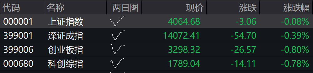 沪指低开0.08%,深成指低开0.39%,创业板指低开0.80%。科创综指低开0.78%。