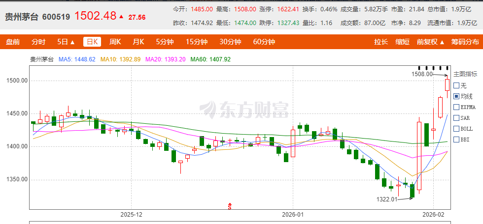目前,贵州茅台股价自2月2日起已连续三日上涨。2月2日涨1.86%,2月3日股价涨超3%。