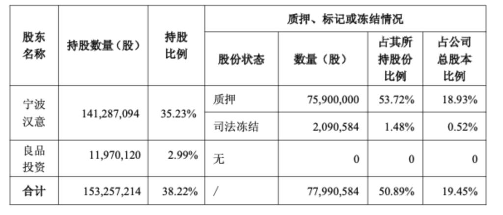 宁波汉意及其一致行动人宁波良品投资管理有限公司(简称:良品投资)合计持有良品铺子38.22%的股份,持股数量为1.53亿股。其中宁波汉意有7590万股处于质押状态,占其所持股份比例53.72%,占公司总股本比例18.93%;司法冻结股份209万股,占其所持股份比例1.48%,占公司总股本比例0.52%。