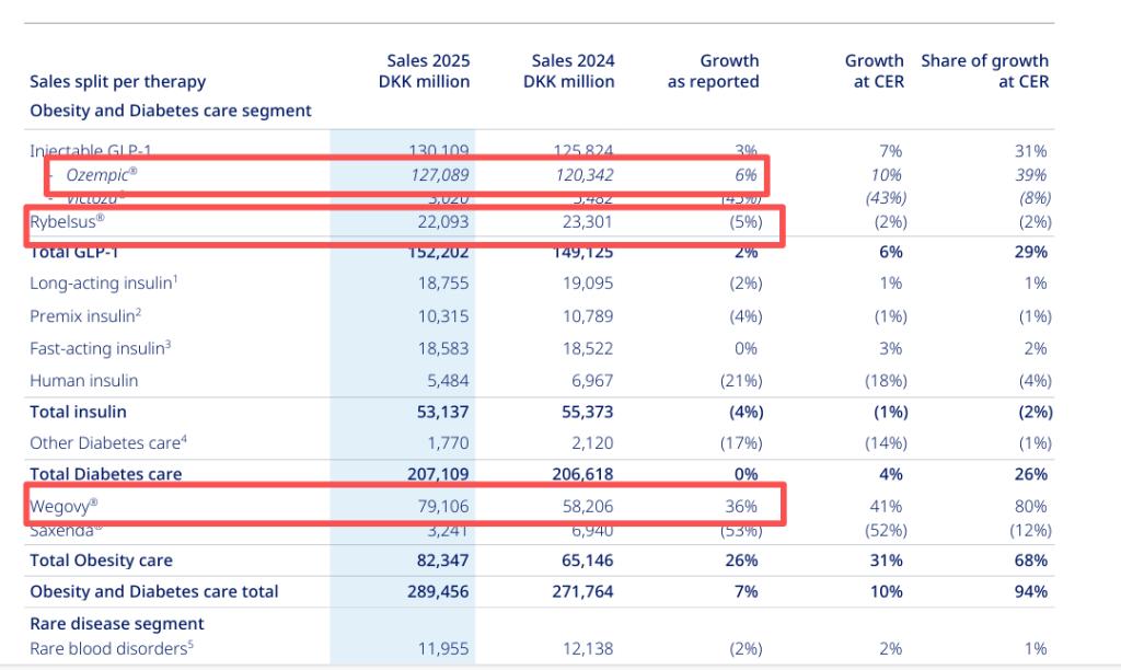 当前,司美格鲁肽是诺和诺德的王牌产品。具体来看,2025年,降糖版司美格鲁肽降糖Ozempic销售额1270.89亿丹麦克朗,约合201亿美元,同比增长10%;减重版司美格鲁肽Wegovy销售额791.06丹麦克朗,同比增长36%,口服降糖版司美格鲁肽Rybelsus收入220.93亿丹麦克朗,同比下降5%。