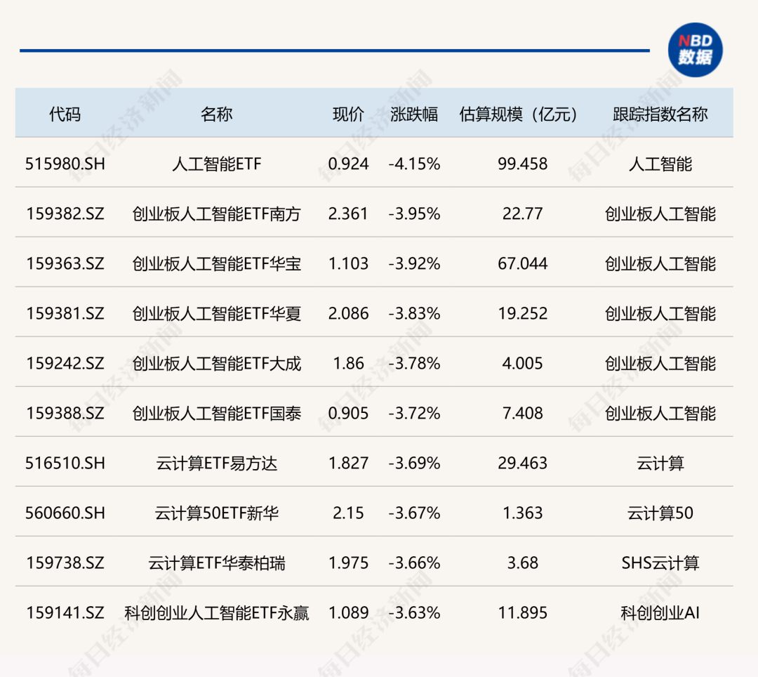 下跌方面,人工智能ETF跌超4%。