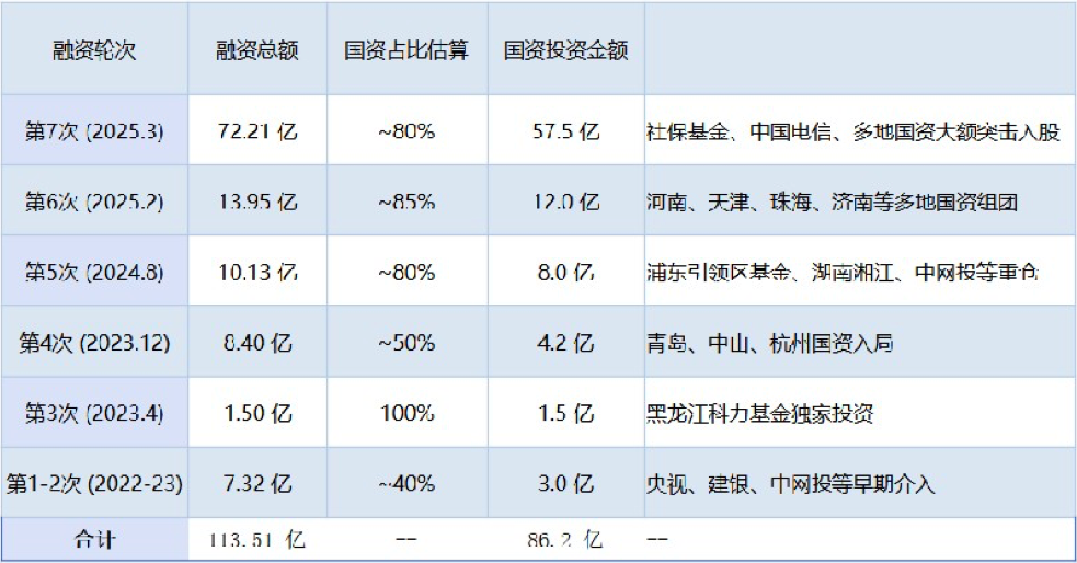 在招股书的报告期内(2022年9月至2025年3月),沐曦完成了7次增资,累计融资金额为人民币113.5亿元,其中86.2亿元来自国资背景的机构。尤其是2023年之后的历次融资,基本都是由国资主导。