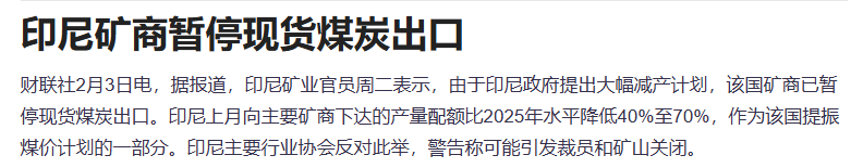 据报道,印尼矿业官员周二表示,由于印尼政府提出大幅减产计划,该国矿商已暂停现货煤炭出口。这一边际变化已导致印尼现货煤价在24小时内跳涨2-3美元,短期内将放大一季度亚洲(尤其是印度、越南)的供给缺口,并有望传导至国内市场,驱动煤炭价格超预期走强。