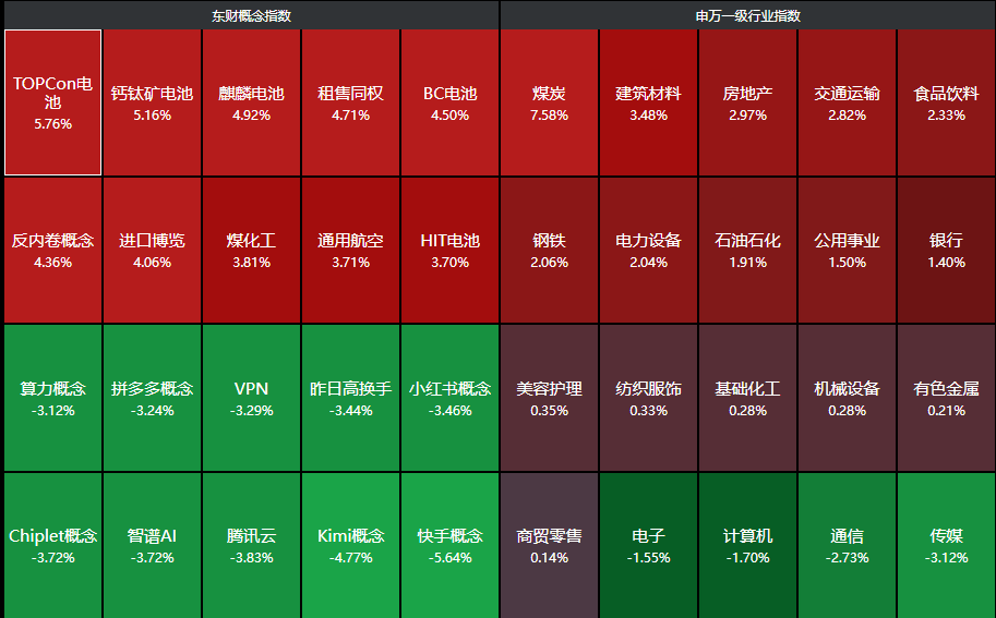 分行业来看,煤炭、建筑材料、房地产、交通运输、食品饮料等行业领涨,传媒、通信、计算机等行业领跌。