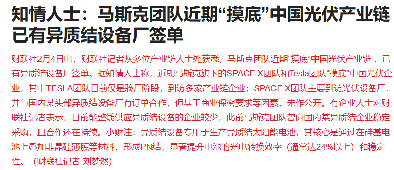 据报道,马斯克团队近期“摸底”中国光伏产业链 ,已有异质结设备厂签单。据知情人士称,近期马斯克旗下的SPACE X团队和Tesla团队“摸底”中国光伏企业,其中TESLA团队目前仅是验厂阶段,到访多家产业链企业。