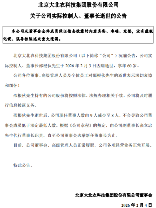 2月4日盘后,大北农公告,公司实控人、董事长邵根伙于2026年2月3日因病逝世,享年60岁。