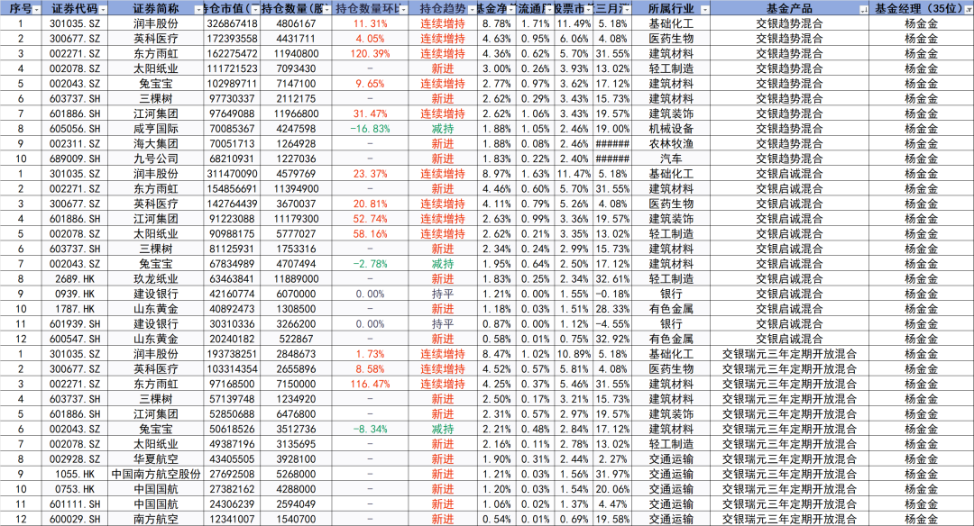 以东方雨虹为例,杨金金在2025年3季度开始配置东方雨虹,买入541万股,4季度加仓到1194万股。