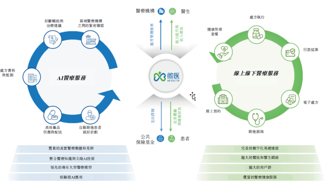 从营收结构的变化能看出这一转型。目前,它的业务分为两大块:AI医疗服务和线上线下医疗服务。