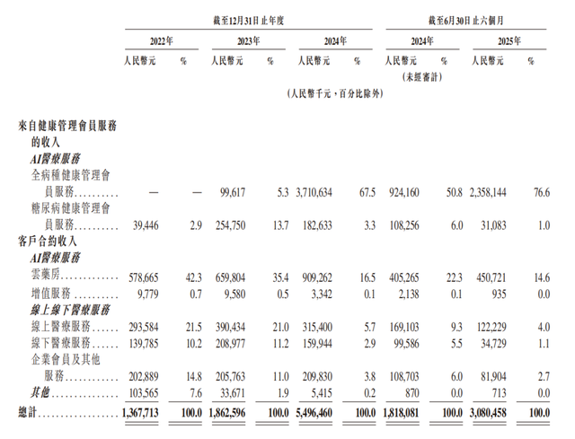 分业务来看,其中,被冠以“AI”标签、与“健共体”模式绑定的医疗服务(含健康管理会员服务、云药房、增值服务),占比也从2022年的45.9%,增长至2025年上半年的92.2%,尤其是健康管理会员服务,已成为绝对的收入支柱。